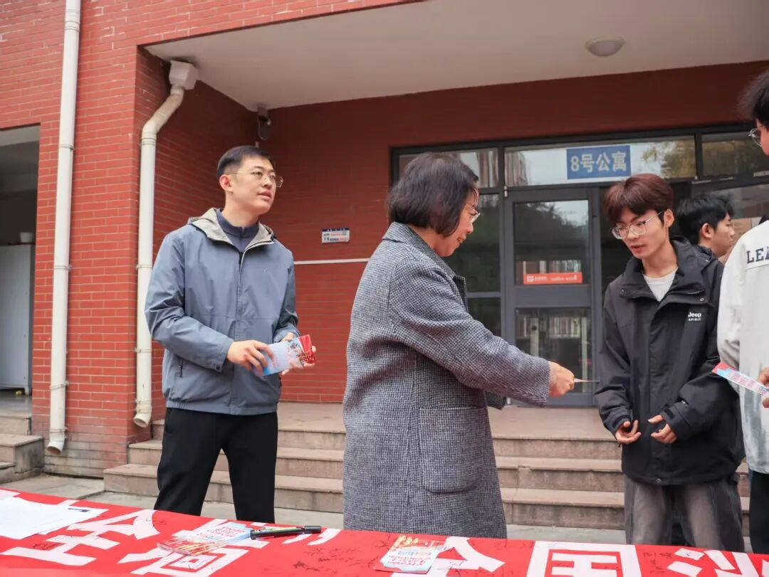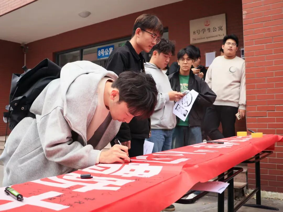 活动开始前,工作人员在8号楼门口张贴安全宣传海报,海报内容涵盖火灾报警流程、初期火灾处置方法、消防器材使用示意图、校园常见火灾隐患等实用信息,吸引了广大学生关注。随后,同学们有序在横幅上签名,通过签名仪式,强化了学生的消防安全责任意识,让“关注消防、重视安全”的理念深入人心。最后,张玉霞副书记和刘宇恺老师在8号楼门口向过往学生逐一发放消防安全传单,确保每位参与学生都能获取宣传资料,扩大知识普及覆盖面。